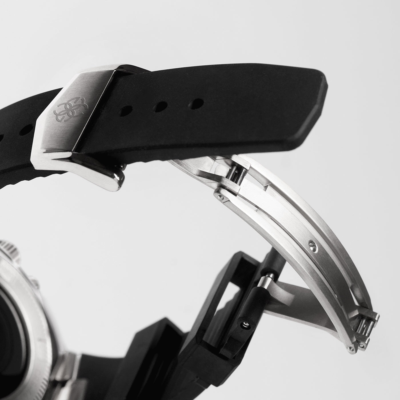Our latest strap innovation is all about simplicity and durability. Made from top-grade fluoroelastomer for lasting comfort and equipped with a sturdy stainless steel mechanism, it's designed for quick and effortless attachment. Snap it on or off seamlessly, ideal for the active and practical user.