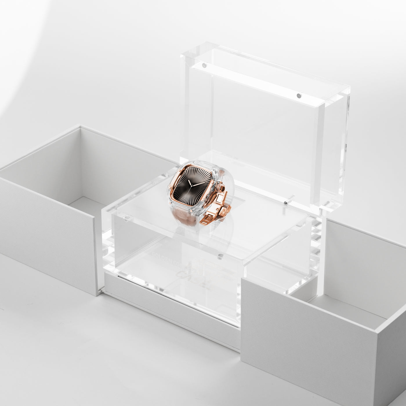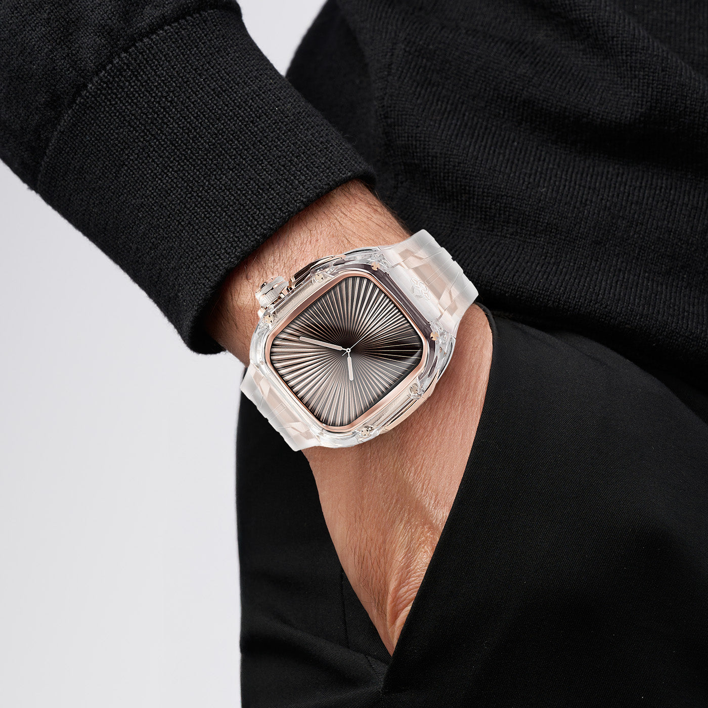 Made of transparent nylon, this case offers a glimpse into the inner workings of your watch and watch case. Its engineered facets catch and reflect light, creating a dynamic interplay of transparency and depth, beautifully complementing the rose gold stainless steel details and enhancing the design from every angle.