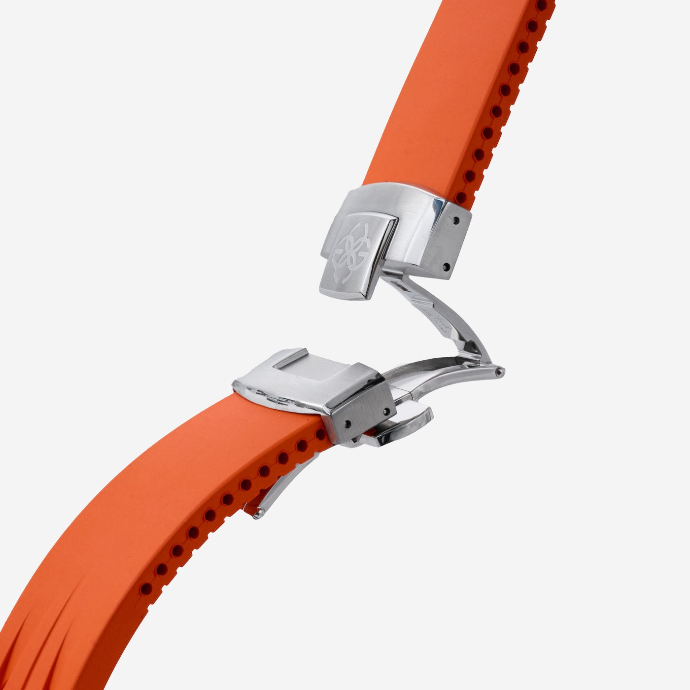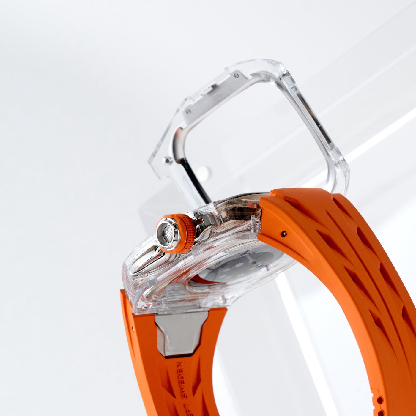 The Sunset Orange strap energizes the transparent case with a vivid burst of color. Made from high-performance Fluoroelastomer - originally developed to resist harsh environments - it offers lasting comfort and flexibility. Finished with a polished steel clasp and easy click-on system, it delivers both style and convenience.