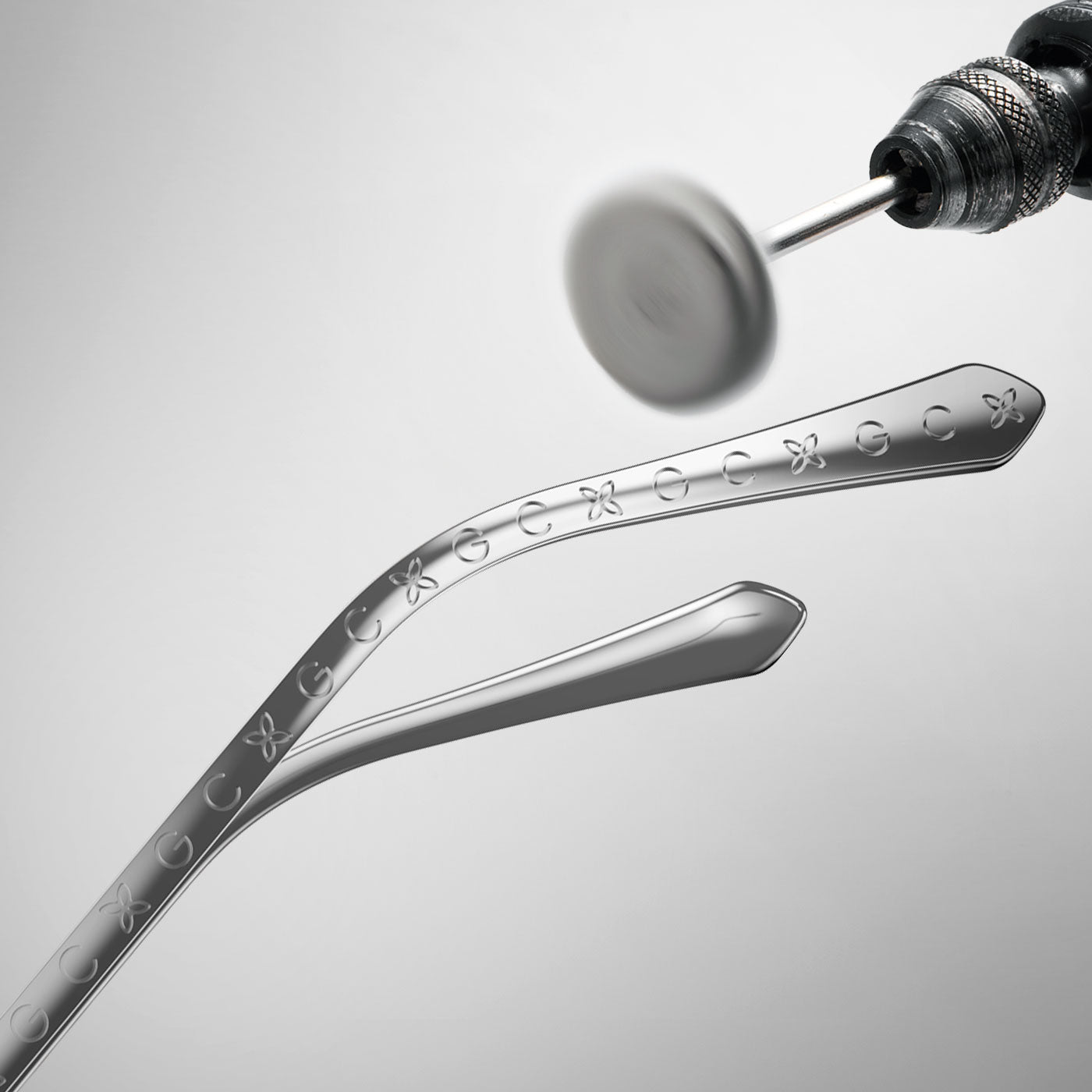 The sunglasses are crafted to be as exquisite as the finest precious jewelry. Utilizing the Guilloché technique, we create distinctive detailing on the bridge, temples and side shields, enhancing their uniqueness. The signature GC pattern flows seamlessly from the temple to the temple tip, enhancing the overall design. A GC logo adorns the end piece, making a subtle brand statement.